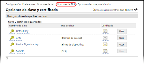 Haga clic en [Usar] a la derecha de la clave y el certificado que hay que usar.