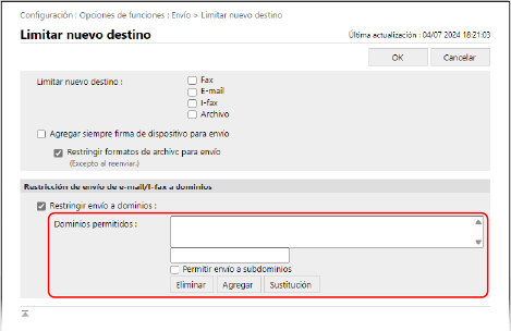 Puede restringir los destinos de e-mail e I-fax a las direcciones de un dominio específico. Además, puede permitir el envío a un dominio específico a la vez que restringe el envío a subdominios.