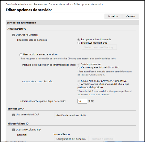 Configure la información de Active Directory, el servidor LDAP o Microsoft Entra ID en [Servidor de autenticación].