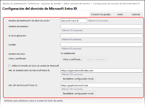 [Tiempo para reinicio automático][URL de autenticación de Microsoft Entra ID] y [URL API de Microsoft Entra ID]