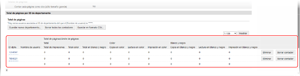 En el ID de departamento cuyo recuento desee reiniciar, haga clic en [Borrar contador]