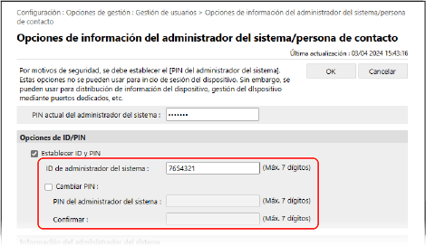 Para cambiar un PIN, marque la casilla [Cambiar PIN] e introduzca el mismo PIN en [PIN del administrador del sistema] y [Confirmar].