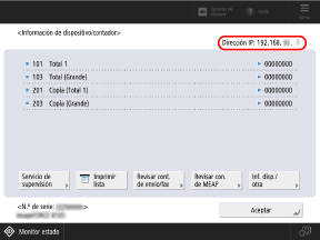 También puede utilizar el procedimiento siguiente para consultar la dirección IPv4 en la pantalla [Información de dispositivo/contador].
