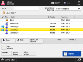 Seleccione un archivo y pulse los botones para realizar diversas operaciones. También puede realizar operaciones con carpetas, como por ejemplo, crear o eliminar una carpeta.