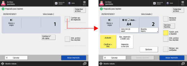 Pulse [Cambiar opc. de impresión] en la parte superior derecha de la pantalla para configurar las opciones siguientes: