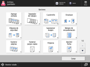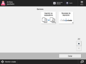 Pulse los botones de esta pantalla para configurar las opciones de impresión detalladas. Tras configurar las opciones de impresión, pulse [Cerrar] para volver a la pantalla de opciones de impresión.