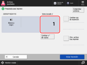 Para imprimir según las opciones de impresión guardadas en un archivo, no pulse [Cambiar opc. de impresión]. Al pulsar [Cambiar opc. de impresión] puede deshabilitar las opciones de impresión guardadas.