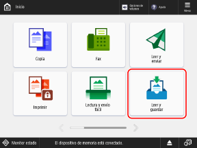 En el panel de control, escanee un documento con el equipo desde [Leer y guardar] en la pantalla [Inicio], y guarde los datos escaneados en un dispositivo de memoria USB.