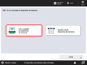 Cuando aparece una pantalla de acceso directo con funciones disponibles tras insertar un dispositivo de memoria USB en el equipo, puede pulsar [Leer y guardar en dispositivo de memoria] para guardar inmediatamente los datos desde [Leer y guardar].