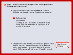 Si aparece [Modo funciones limitadas] en la pantalla, puede pulsarlo y seguir utilizando el equipo antes de solucionar el problema. Sin embargo, las funciones utilizables son limitadas.