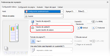 En [Tamaño de salida] en la pestaña [Configuración básica], compruebe o establezca el tamaño de papel en el que desea imprimir.