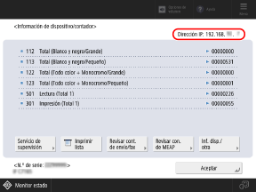 compruebe la dirección IPv6.En el panel de control, pulse [ ] en la pantalla [Inicio] u otra pantalla para mostrar la pantalla [Información de dispositivo/contador], y compruebe la dirección IPv4.![]() * Cuando el equipo está conectado a dos redes diferentes al mismo tiempo, las direcciones IPv4 de las líneas principal y secundaria se muestran una al lado de la otra. |