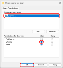 For [Permissions], select the [Allow] checkbox for [Change].