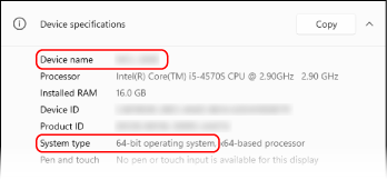 Under [Device specifications], check the computer name and operating system version.