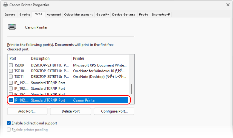 On the [Ports] tab, check that the [Enable bidirectional support] checkbox is selected.