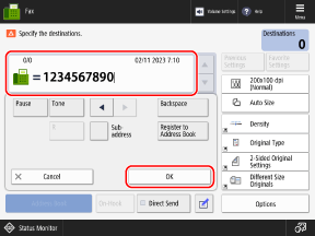 To specify a destination not registered in the Address Book or LDAP server, directly enter the destination on the scan (Scan and Send) or fax screen of the control panel.
