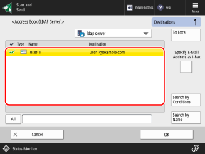 When user information is managed with an LDAP server, you can search for that information and specify destinations from the scan (Scan and Send) or fax screen of the control panel.