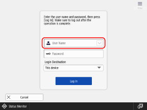 To log in to the machine, press [ Log In] in the [Home] screen, and enter the required information on the displayed login screen. [Home] Screen