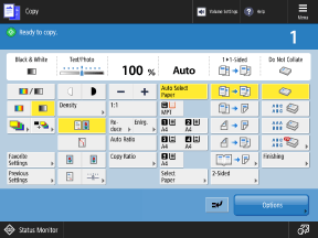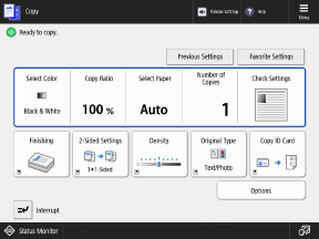 When you switch to the Express Copy screen, the setting statuses of basic functions such as enlarging, reducing, and 2-sided copying are displayed as buttons. Since you can set these functions simply by pressing the buttons for the displayed setting values, there are fewer steps than when using the Regular Copy screen.