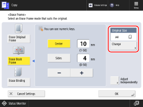 When you copy onto a larger paper size than that of the original, or when you copy pages of a thick book, dark borders or shadows may appear around the edges of the original. You can configure the settings to erase the borders or shadows when copying. You can also erase punch holes on the original.