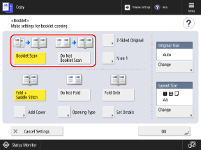 Normally, select [Booklet Scan]. If you are using an original with pages that are already arranged in booklet layout, select [Do Not Booklet Scan].