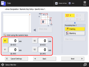 3, press [Numeric Key Entry], and specify the area by using the numeric keys to enter the values for [X1] to [Y2] with the top right of the original as the reference point.