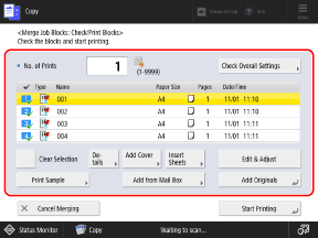 On the copy screen, press [Options] [Merge Job Blocks]. Copy Screen