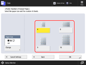 To make a divided copy, you can either specify the copy ratio of the original or specify the paper and number of sheets to be used.