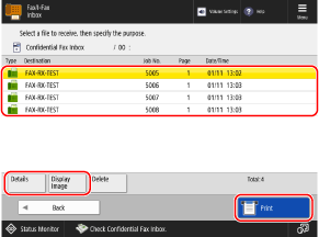 Select a received fax and press [Details] to check details such as the size of the fax.