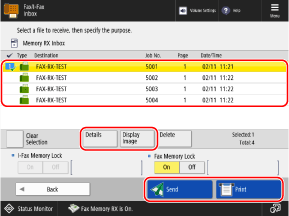 Select a received fax and press [Details] to check details such as the size of the fax.