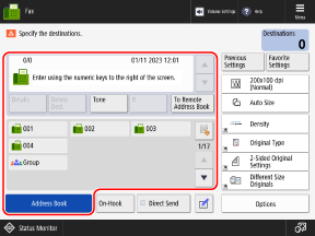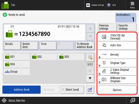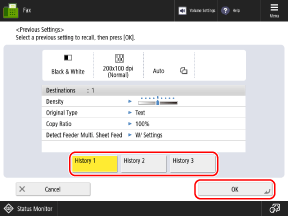 You can press [Previous Settings] to call up the settings used to send faxes in the past. The sending destination is also applied together with the settings that are called up.