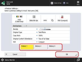 Hiding Destinations (Access Number Management)On the [Previous Settings] screen, select the history you want to recall, and press [OK].