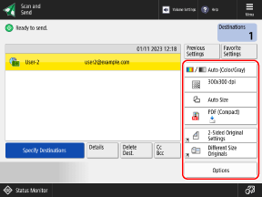 You can change the called up destination and scan settings before sending.