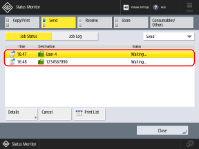 Press [Send] or [Receive], and press [Job Status].