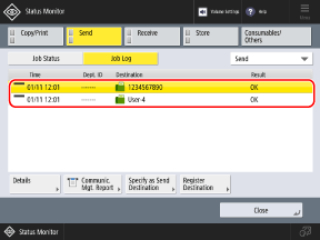 * If the log is set not to be displayed, you can only check the sending and receiving status. [Display Job Log]