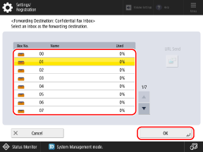 Select the Confidential Fax Inbox to be used as the forwarding destination or store location, and press [OK].