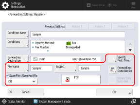You can also configure the settings to forward or store all received faxes, or you can specify days or time periods for forwarding or storing faxes so that, for example, faxes received on holidays are forwarded by e-mail.