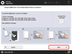 Adjust the saddle stitch fold position and staple position so that they are at the center of the paper. Print a test page, check the current state of the fold position and the shift width on the test page, and then perform adjustment.