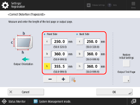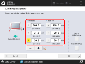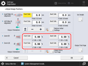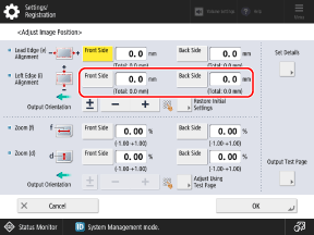 * When you display the [Adjust Image Position] screen after performing Adjust Left Edge Alignment or Adjust Lead Edge Alignment, the value on the screen is reset to "0.0 mm," but the previously set value is retained. If you want to repeat the adjustment, check the indicator on the reprinted test page and set that value.