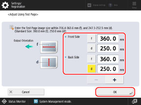 Press [Adjust Using Test Page], enter the measured values in [f] and [d], and press [OK]