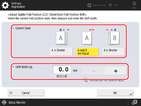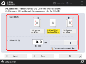 For [Adjust Saddle Stitch Fold Position], press [+] to move the fold position toward the right of the print side, and press [-] to move the fold position toward the left of the print side.