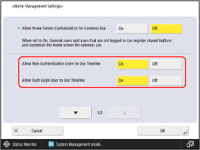 You can configure settings such as whether to display the Timeline on the [Home] screen, and the items that general users can customize on the [Home] screen.