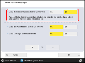 Set this to [On] to allow users other than administrators to add Shared buttons and make changes to the [Customize for Common Use] settings.
