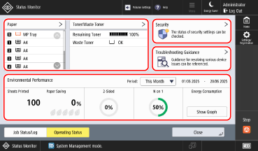 You can display a screen to check the status of multiple items together, such as the remaining amount of paper and toner, the status of the machine's security measures, support information for troubleshooting problems that occur during faxing and printing, and the print job status and power consumption within a specified time period.