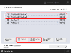 You can check the numbers of printed and copied pages by referring to the items indicated by "Total" or "Copy" on the [Counter/Device Information] screen.