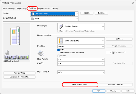 On the [Finishing] tab, click [Advanced Settings].