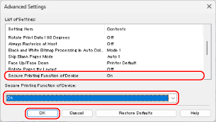 Click [Secure Printing Function of Device], select [On], and click [OK].