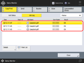 * If the log is set to not be displayed, you can only check the print job status. [Display Job Log]