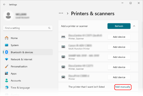 Click [] (Start) [] (Settings) [Bluetooth & devices] [Printers & scanners].