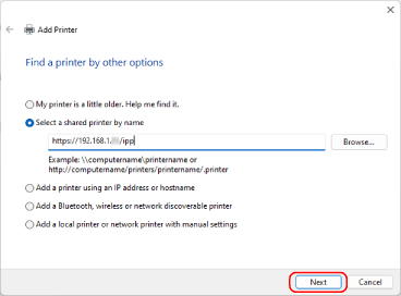 Select [Select a shared printer by name] and enter the connection destination, and click [Next].